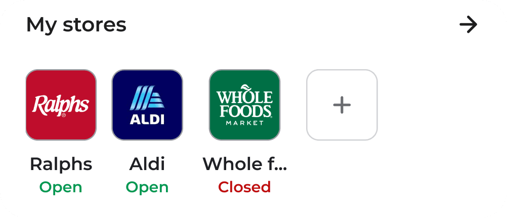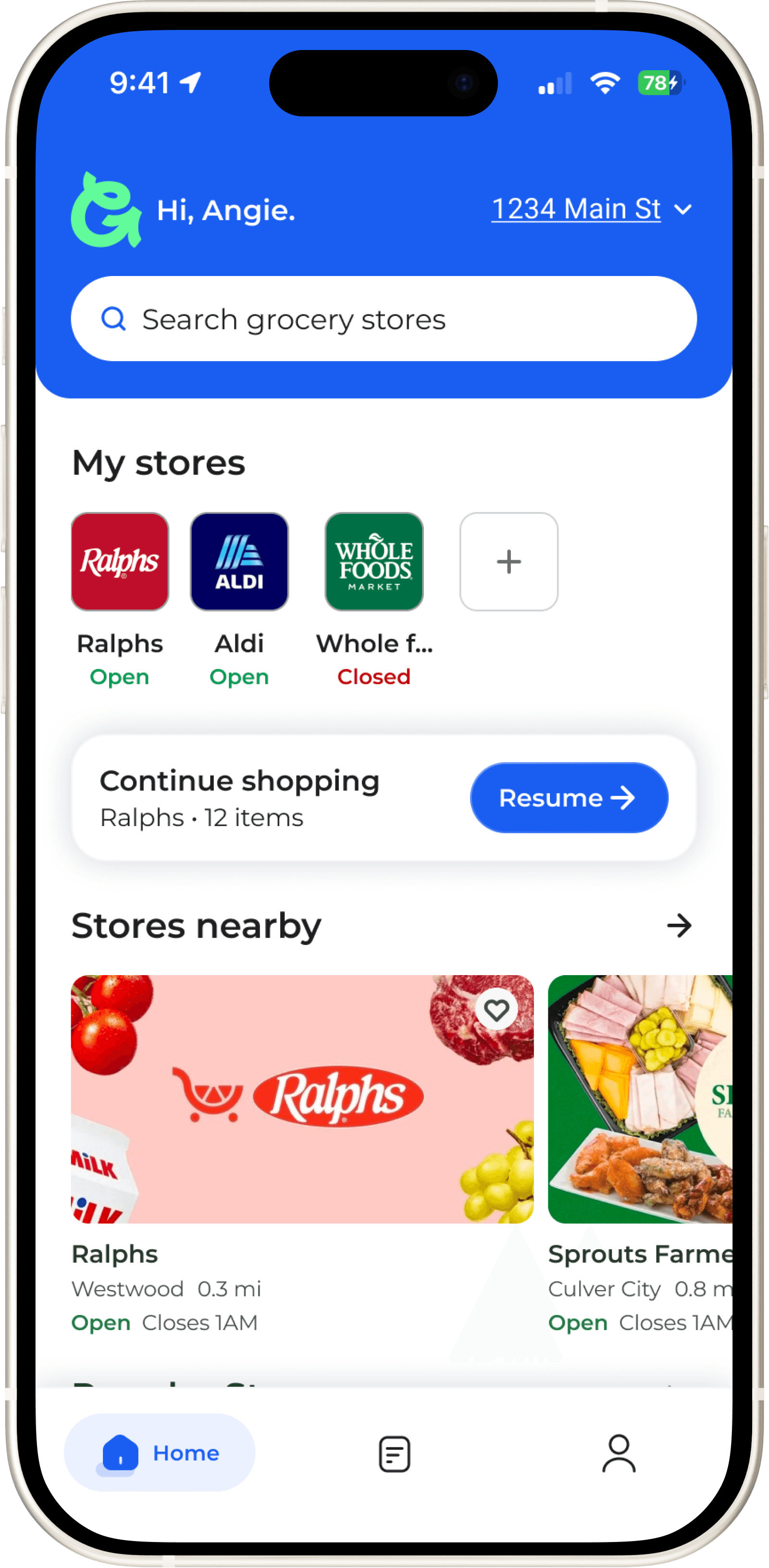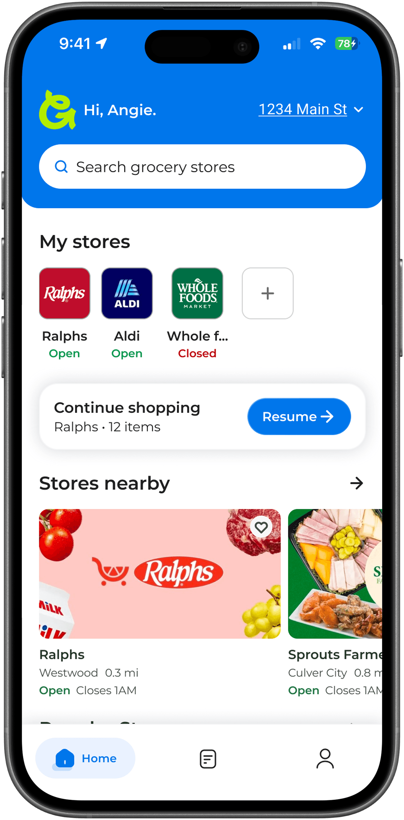 The homepage streamlines your grocery run: quickly resume active lists, access favorite stores, and locate nearby stores.