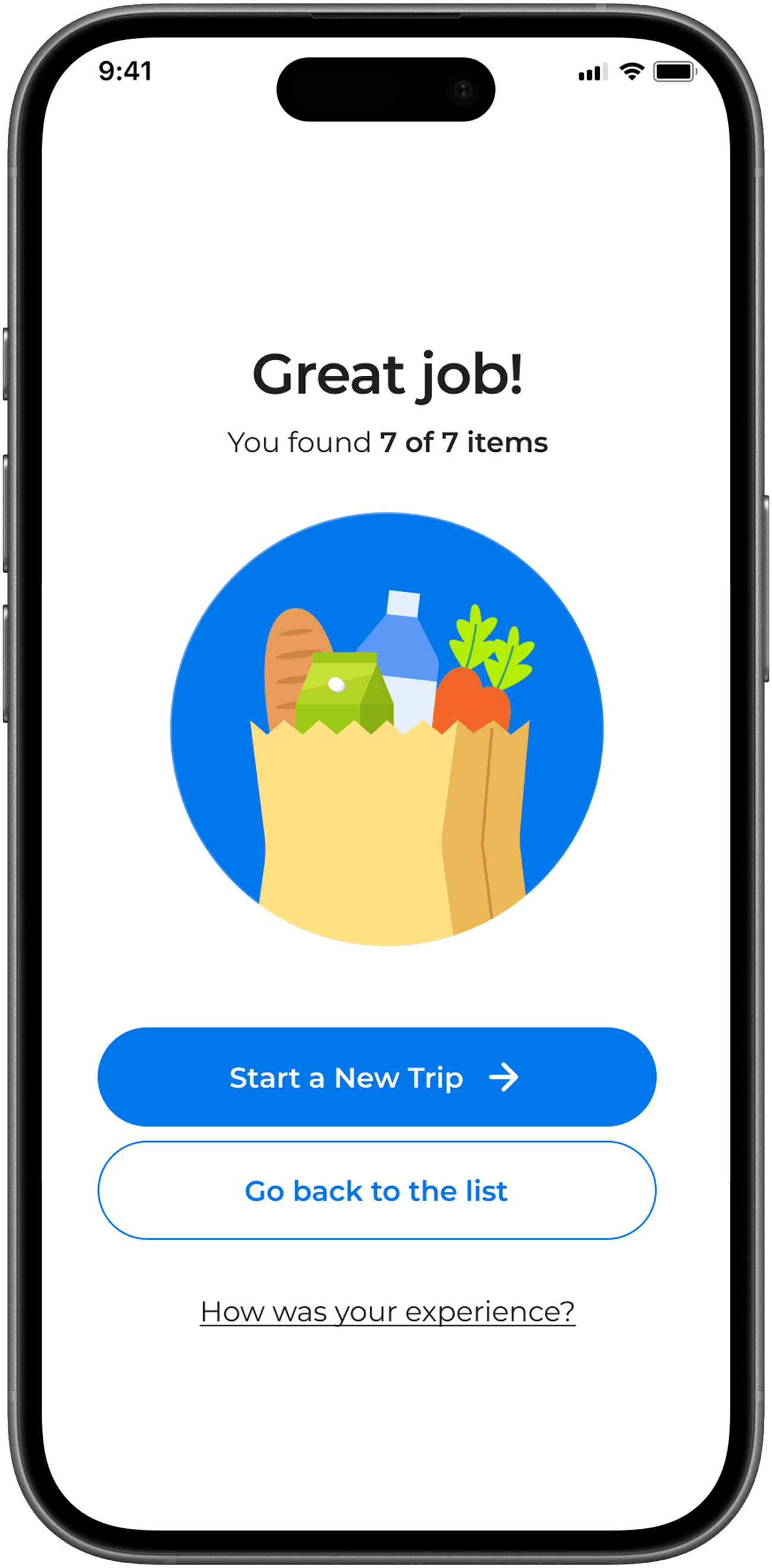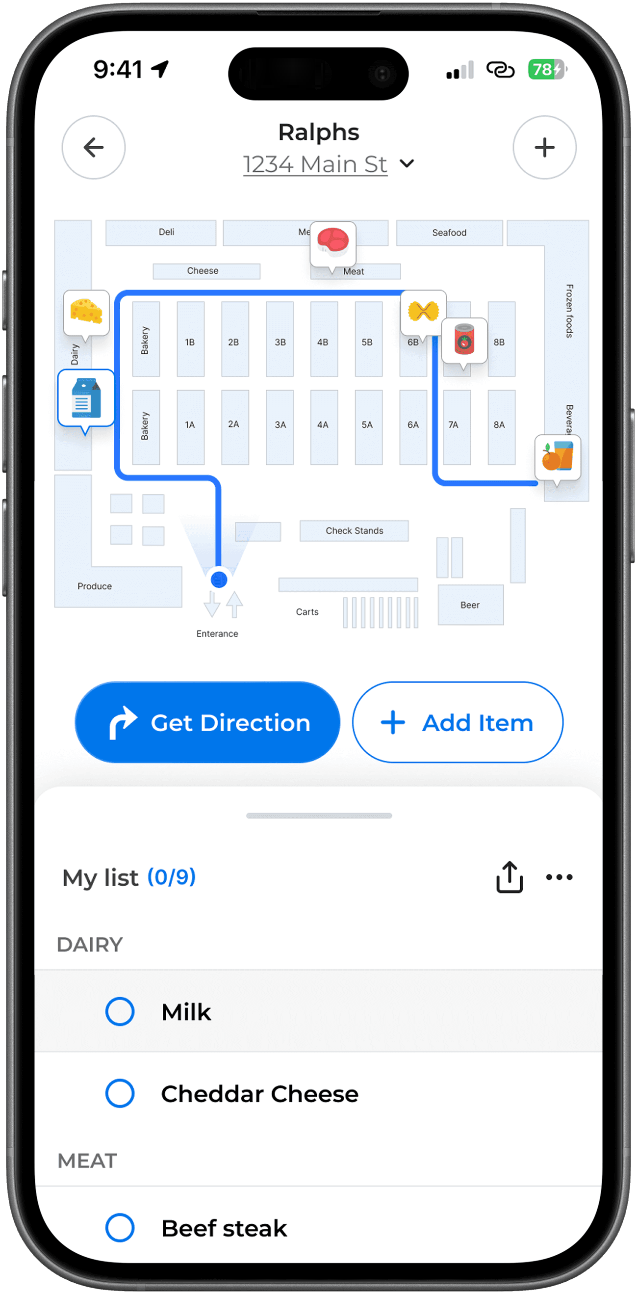 Items are automatically organized into a shopping list and displayed on the map.