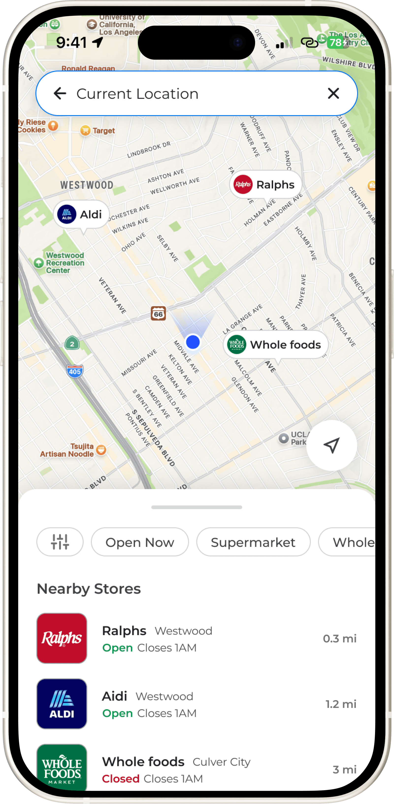 User selects a store to view its map, search for items, and locate them instantly.